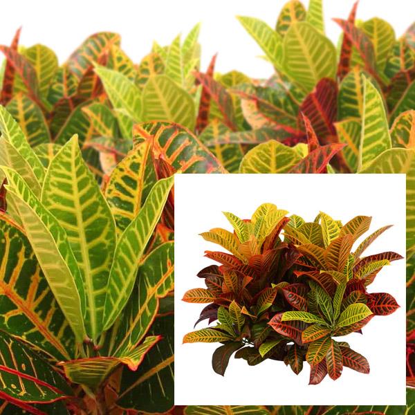 Few indoor tropical plants have leaves as richly multi-colored as Croton. Depending on the cultivar, a single Croton can display vivid greens, yellows, oranges, reds and purples — sometimes all together on the same leaf! Croton, also known as "Rushfoil," can be used to fill in the bottom of a large display with color, or be planted here and there for a splash of hues. Croton is ideal for large containers, often treated as the primary specimen and bordered with green plants with contrasting textures.